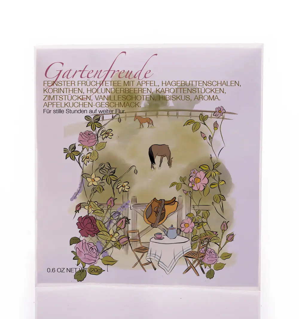 FEINSTER FRÜCHTETEE MIT APFEL, HAGEBUTTENSCHALEN, KORINTHEN, HOLUNDERBEEREN, KAROTTENSTÜCKEN, ZIMTSTÜCKEN, VANILLESCHOTEN, HIBISKUS, AROMA. APFELSTRUDEL-GESCHMACK.